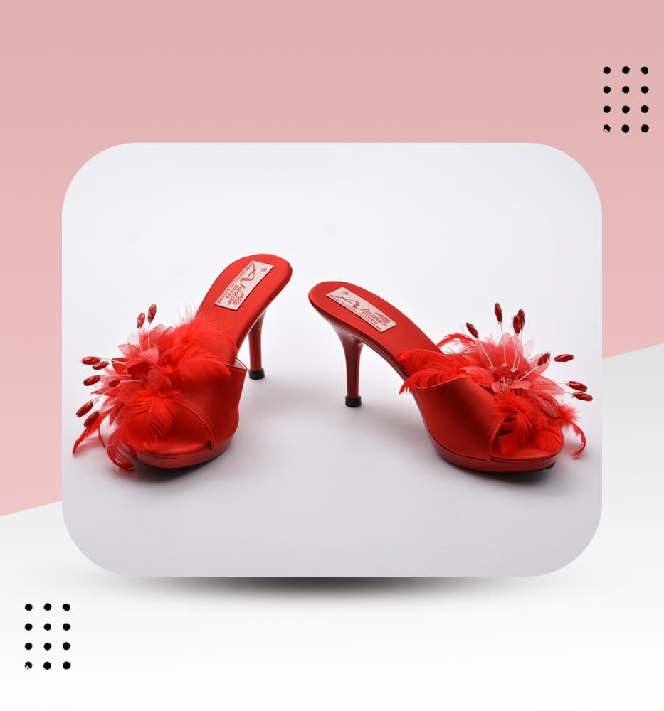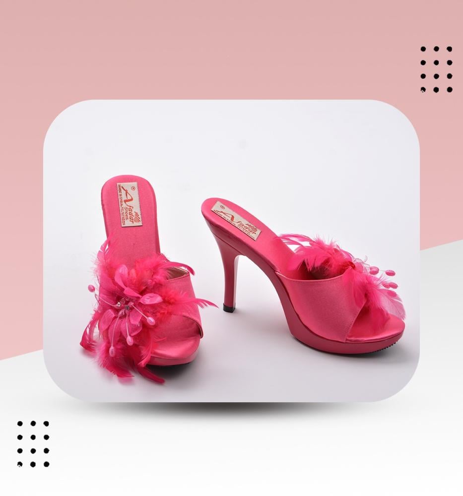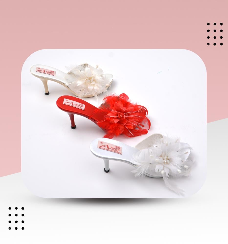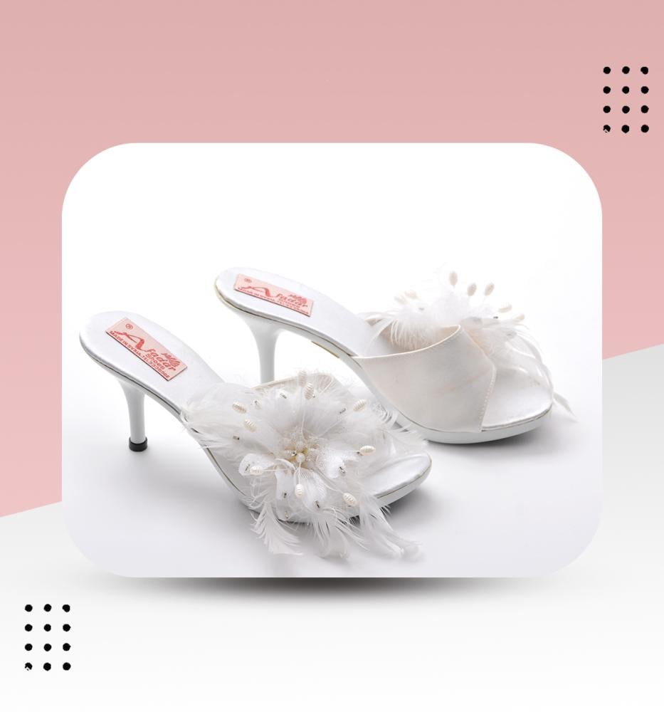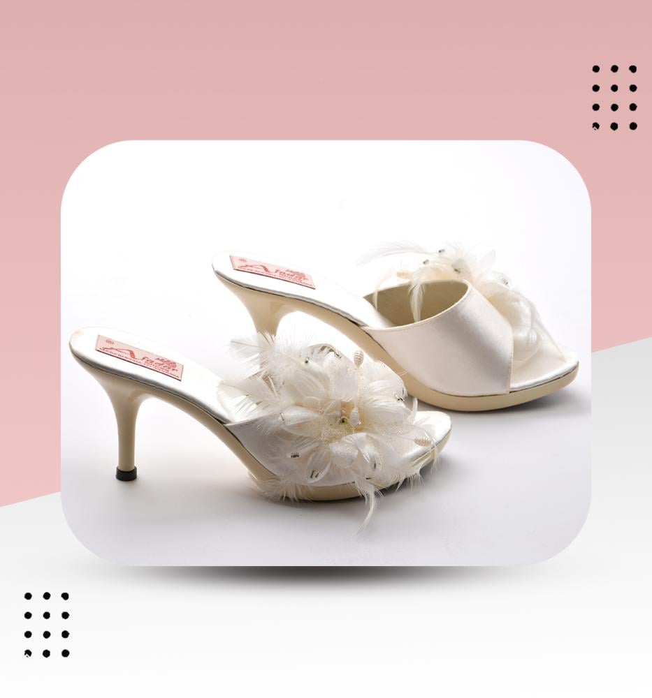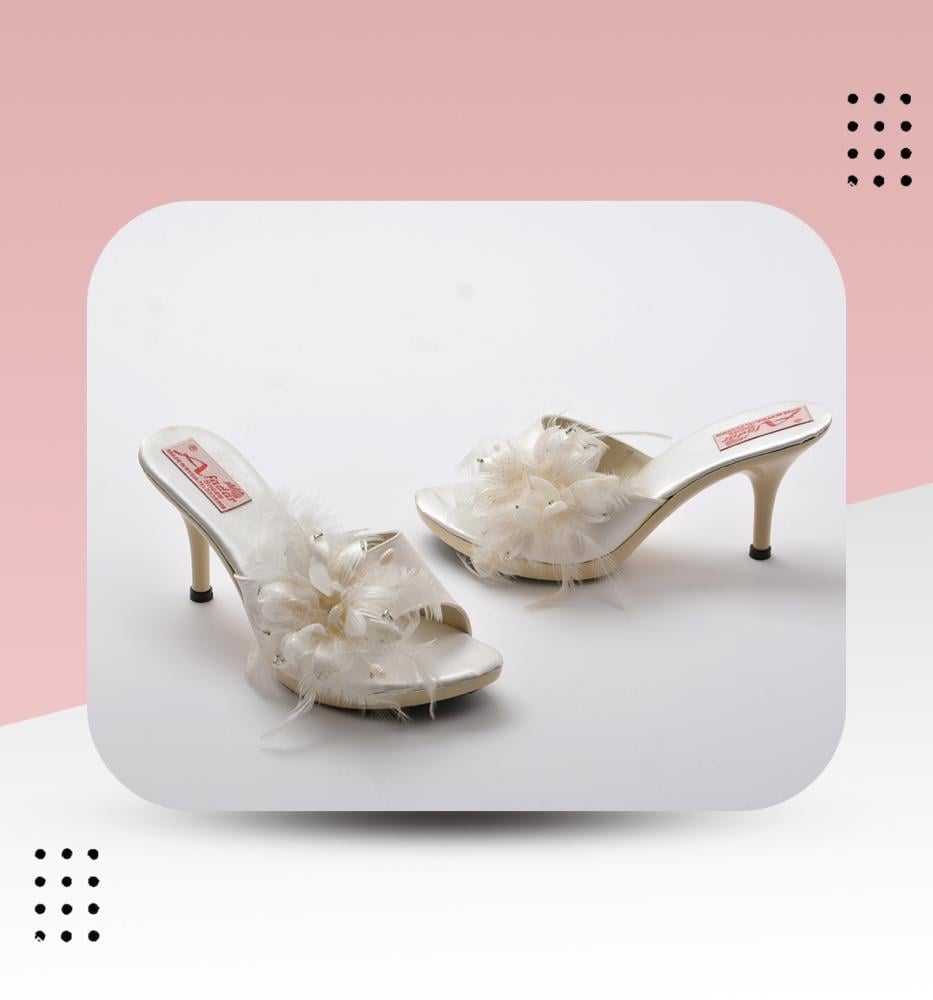 - شبشب مريح كعب وسط مغطى بزهور صناعية جميلة يتخللها اجزاء من الريش الانيق والكريستال البراق الانيق .