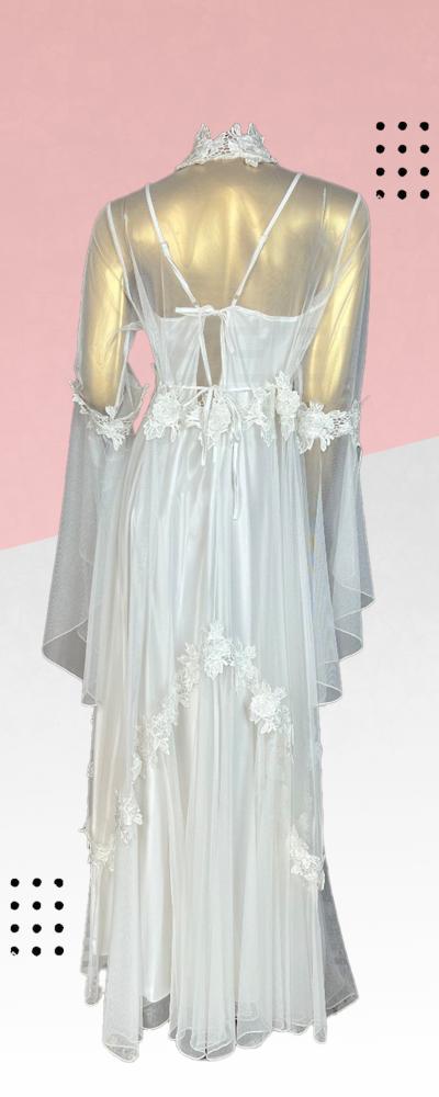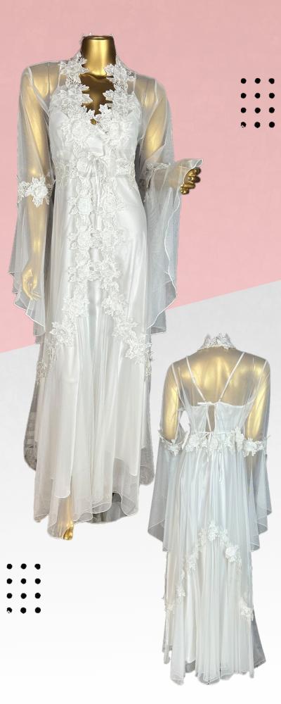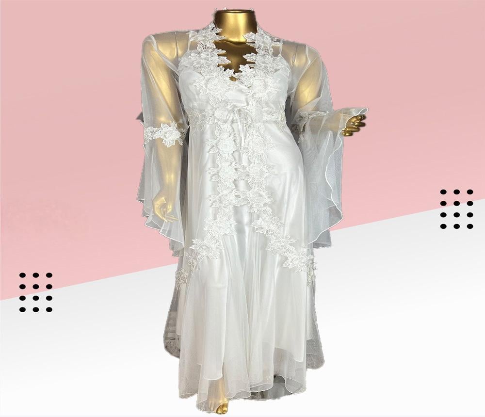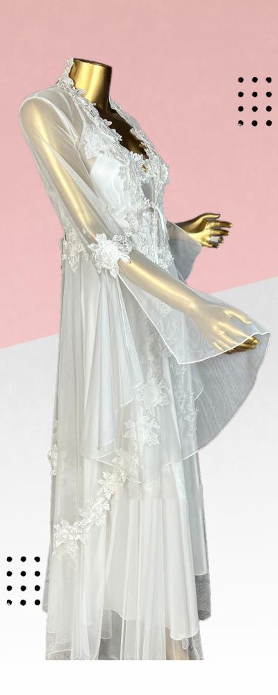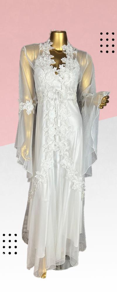 - مكون من قطعتين قميص داخلي حرير بدانتيل انيق جهة الصدر وفتحة ظهر على شكل حرف U بخيوط حريرية للتحكم بالمقاس وروب خارجي تول مطرز بدانتيل من الامام والخلف باكمام راقية واسعة يتوسطها فتحة انيقة مميزة . وخيوط حريرية خلفية للتحكم بالمقاس .