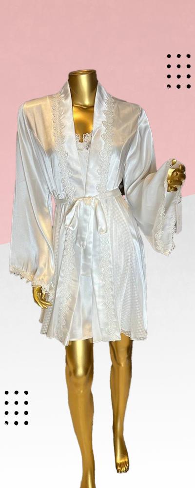 - مكون من قطعتين قميص داخلي حرير بدانتيل انيق جهة الصدر وفتحة ظهر على شكل حرف U بخيوط حريرية للتحكم بالمقاس وروب خارجي حرير مطرز بدانتيل وفتحة ظهر جميلة تعطيك مظهرا جذابا و ثلاث فتحات جانبية مغطاة ب تول شفاف راقي و اكمام راقية انسيابية نهايتها دانتيل ناعم وخيوط حريرية خلفية للتحكم بالمقاس .