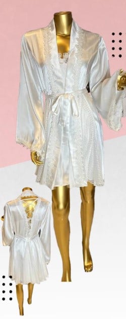 الطقم مكون من قميص داخلي حريري ناعم مزدان بتفاصيل من الدانتيل الراقي عند منطقة الصدر، مع فتحة ظهر على شكل حرف U مدعمة بخيوط حريرية أنيقة تساعدك على التحكم بالمقاس بما يتناسب مع إطلالتك. يرافقه روب خارجي حريري مطرز بالدانتيل الفاخر مع فتحة ظهر أنثوية تزيد من جمال التصميم، إلى جانب ثلاث فتحات جانبية مغطاة بتول شفاف راقٍ تضفي لمسة من الجاذبية والرقي. أما الأكمام فهي انسيابية وواسعة بنهايات من الدانتيل الناعم لتكتمل إطلالتك بسحر لا مثيل له. كما يزدان الطقم بخيوط حريرية خلفية تمنحك مرونة أكبر في التحكم بالمقاس.
