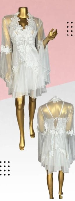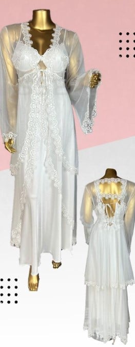 أما القطعة الثانية، فهي روب خارجي فاخر من التول متعدد الطبقات مع تطريزات دانتيل راقية، يزينه من الخلف فتحة ظهر بدانتيل تزيد من جاذبية الإطلالة. تنسدل أكمامه بخفة وانسيابية مع أطراف مزينة بدانتيل ناعم، ليمنحك لمسة رقيقة تحمل مزيجاً من الرقي والجمال. كما زُوّد بخيوط حريرية خلفية للتحكم بالمقاس، مما يجعله عملياً ومريحاً في الاستخدام.